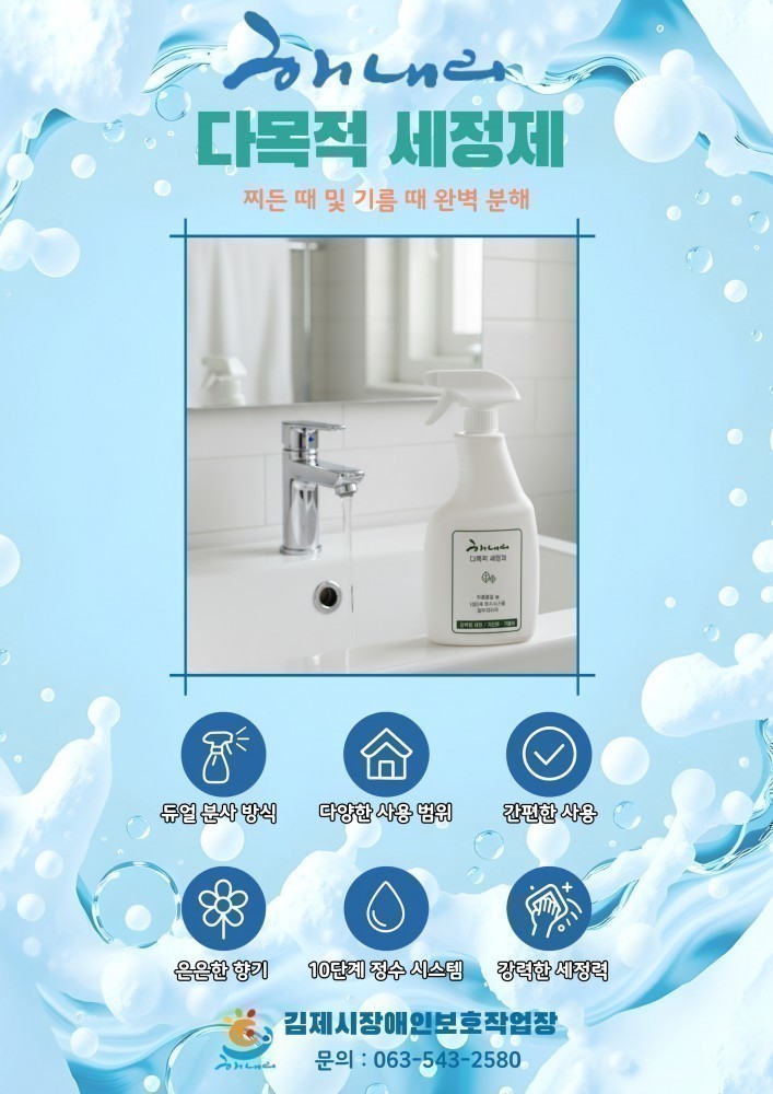 안녕하세요. 김제시장애인보호작업장입니다. 항상 변함없는 소비자분들의 관심과 사랑 덕분에 이번 9월, 신제품 '해내리 다목적 세정제'가 출시되었습니다. 욕실, 주방 등. 다양한 공간에서 기름 때, 찌든를 완벽 분해할 수 있는 다목적 세정제입니다. 많은 관심 부탁드립니다. *문의: 김제시장애인보호작업장(☎ 063-543-2580) *구입: 전국 장애인생산품판매시설