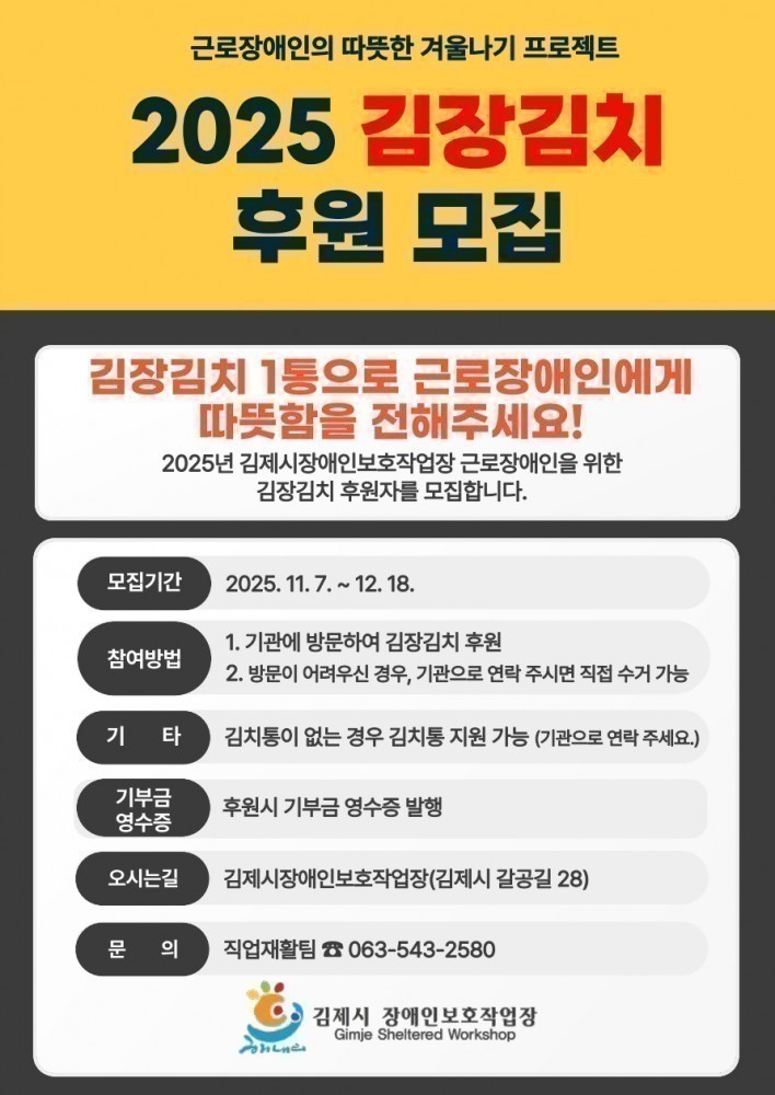 김장김치 1통으로 근로장애인에게 따뜻함을 전해주세요. 2025년 김제시장애인보호작업장 근로장애인을 위한 김장김치 후원자를 모집합니다. -기 간 : 2025. 11. 7. ~ 12. 18. -방 법 : 기관 방문하여 김장김치 후원 또는 기관으로 연락주시면 직접 수거 가능 ※ 김치통 필요시 기관에서 지원 가능합니다. -후원대상 : 근로장애인 -문 의 : 김제시장애인보호작업장(☎063-543-2580)